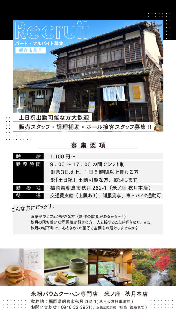 【米粉バウムクーヘン専門店 米ノ座 秋月本店】パート・アルバイト募集のお知らせ